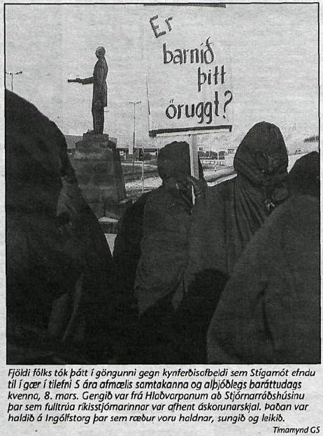 Þann 8. mars 1995 gengu Stígamótkonur fylktu liði frá Hlaðvarpanum að stjórnarráðsbyggingunni þar sem þær afhentu ríkisstjórninni áskorunarskjal. Þaðan var haldið niður á Ingólfstorg þar sem ræður voru haldnar, sungið og leikið eins og segir í myndatexta. Gangan var farin í tilefni Alþjóðlegs baráttudags kvenna og 5 ára afmælis Stígamóta. Þessi mynd var tekin af því tilefni: