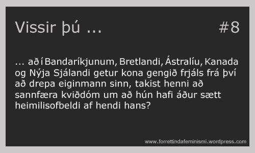 Sjá: https://forrettindafeminismi.wordpress.com/2011/06/24/battered-wife-syndrome-innleitt-i-islenskt-rettarfar/