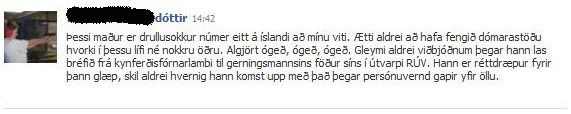 Hér tekur karlmaður þátt í umræðu um nauðgunarkæru sem þá hafði nýlega verið lögð fram gegn þjóðþekktum karli og spúsu hans. Þessi ummæli er sett fram af yfirvegun, fella enga dóma og eru meira að segja sett fram með þeim fyrirvara að vel kunni vel að vera að karlinnn reynist svo sekur (athyglisvert er að í athugasemdinni er ekki minnst orði á unnustu karlsins sem einnig sætir ákæru).