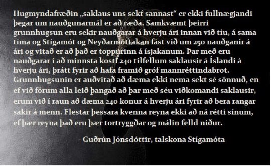 „en ef við förum alla leið þangað að þar með séu viðkomandi saklausir, erum við í raun að dæma 240 konur á hverju ári fyrir að bera rangar sakir á menn.“, hérna er á ferðinni kjánaleg rangtúlkun hjá henni Guðrúnu að mínu mati, mennirnir eru ekki endilega saklausir, en það má ekki refsa þeim ef ekki er búið að sanna sekt. Þessi setning fær mig til að trúa því að Guðrún misskilji hvað átt er við þegar það er talað um að menn skuli teljast saklausir uns sekt er sönnuð, þar að auki segir hún að með því að dæma menn ekki seka sé verið að dæma konurnar fyrir að bera þá röngum sökum, þetta er náttulega bara kjánalegt vegna þess að „saklaus uns sekt er sönnuð“ gildir um þær líka, það er að segja að ef ekki er sannað að hinn ákærði hafi nauðgað og ekki er hægt að sanna að kærandi fari með rangt mál, er málinu vísað frá vegna skorts á sönnunargögnum, og það er akkurat það sem gerist í flestum málum miðað við það sem ég hef heyrt.