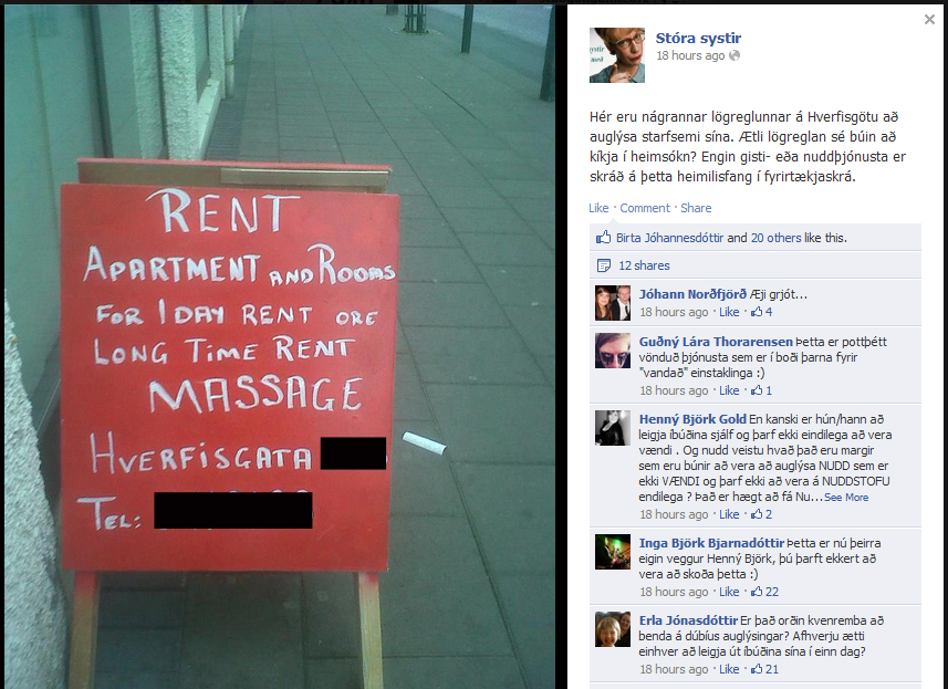 Hér gefur hópurinn sér að með orðinu „massage“ eða nudd sé átt við vændisþjónustu eða erótískt nudd og hikar ekki við að birta myndina óbjagaða með símanúmeri og heimilisfangi ásamt þessum aðdróttunum. Sem betur fer lét skynsamt fólk í sér heyra með athugasemdum við myndina og ekki leið á löngu þar til kona ein sem býr í nágrenni við fólkið sem setti upp auglýsinguna tók til máls og sagði að þarna byggi harðdugleg fjölskylda af erlendum uppruna.