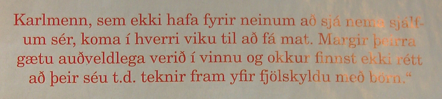 „Við höfum verið gagnrýndar fyrir að mismuna Íslendingum og útlendingum, en sú gagnrýni er óréttmæt. Vegna fjölgunar þeirra sem sækja um aðstoð höfum við brugðið á það ráð að úthluta fílhraustum karlmönnum bara einu sinni í mánuði. Og þetta gildir bæði um íslenska og erlenda karlmenn. Margir útlendingar hafa áunnið sér réttindi til atvinnuleysisbóta. Karlmenn , sem ekki hafa fyrir neinum að sjá nema sjálfum sér, koma í hverri viku til að fá mat. Margir þeirra gætu auðveldlega verið í vinnu og okkur finnst ekki rétt að þeir séu t.d. teknir fram yfir fjölskyldu með börn. Ég veit að þetta hljómar kannski illa en við konurnar erum ekki fæddar í gær og erum orðnar ágætir mannþekkjarar. Konur reyna þetta sjaldnast og við þurfum nánast aldrei að vísa konu frá. Ég legg áherslu á að starf okkar er unnið á vegum Mæðrastyrksnefndar og að okkur ber samkvæmt lögum að sinna fyrst og fremst mæðrum og börnum. En vegna breytts ástands í þjóðfélaginu sinnum við nú einnig einstæðum feðrum með börn á framfæri, eldri borgurum og fleirum.“