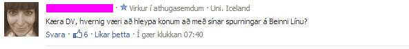 Ég rakst nýlega á hreint frábært dæmi um þessa ofsóknarhugmynd. Ung kona færir inn athugasemd undir frétt á dv.is sem leggur út frá opinni línu þar sem almenningi gefst kostur á að taka viðtal við ungan stjórnmálaáhugamann með því að senda inn spurningar. Allir sem hafa facebook aðgang geta sent inn spurningar og kerfið er galopið.