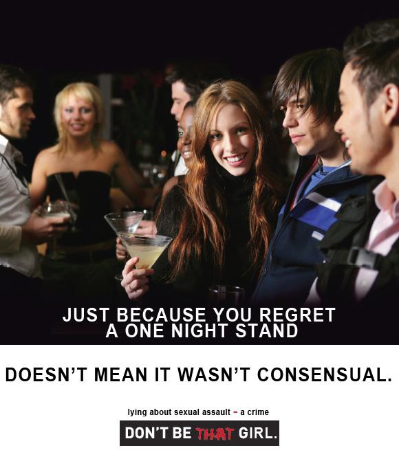 Just because you regret a one night stand, doesn’t mean it wasn’t consensual og Just because she’s easy, doesn’t mean you shouldn’t fear false criminal accusations voru meðal þeirra staðhæfinga sem lesa mátti á Don’t be that girl plakötunum.